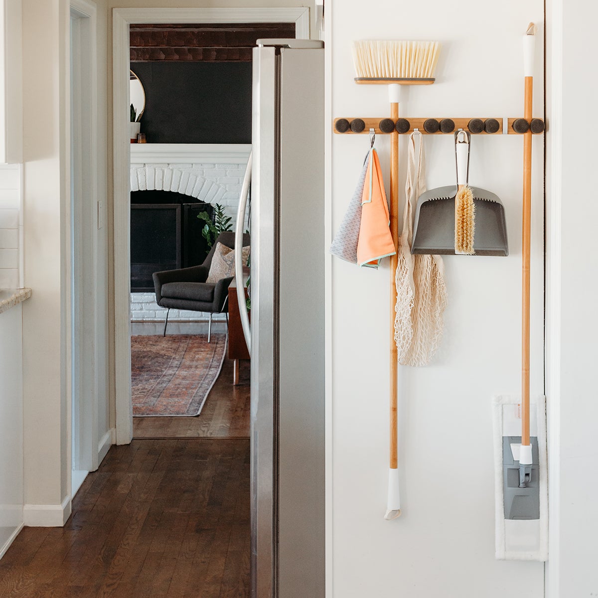 Full Circle’s Dustpan & Brush Set with recycled plastic and bamboo construction efficiently removes dirt, has a built-in comb for brush cleaning, and features a rubber lip for a clean sweep.